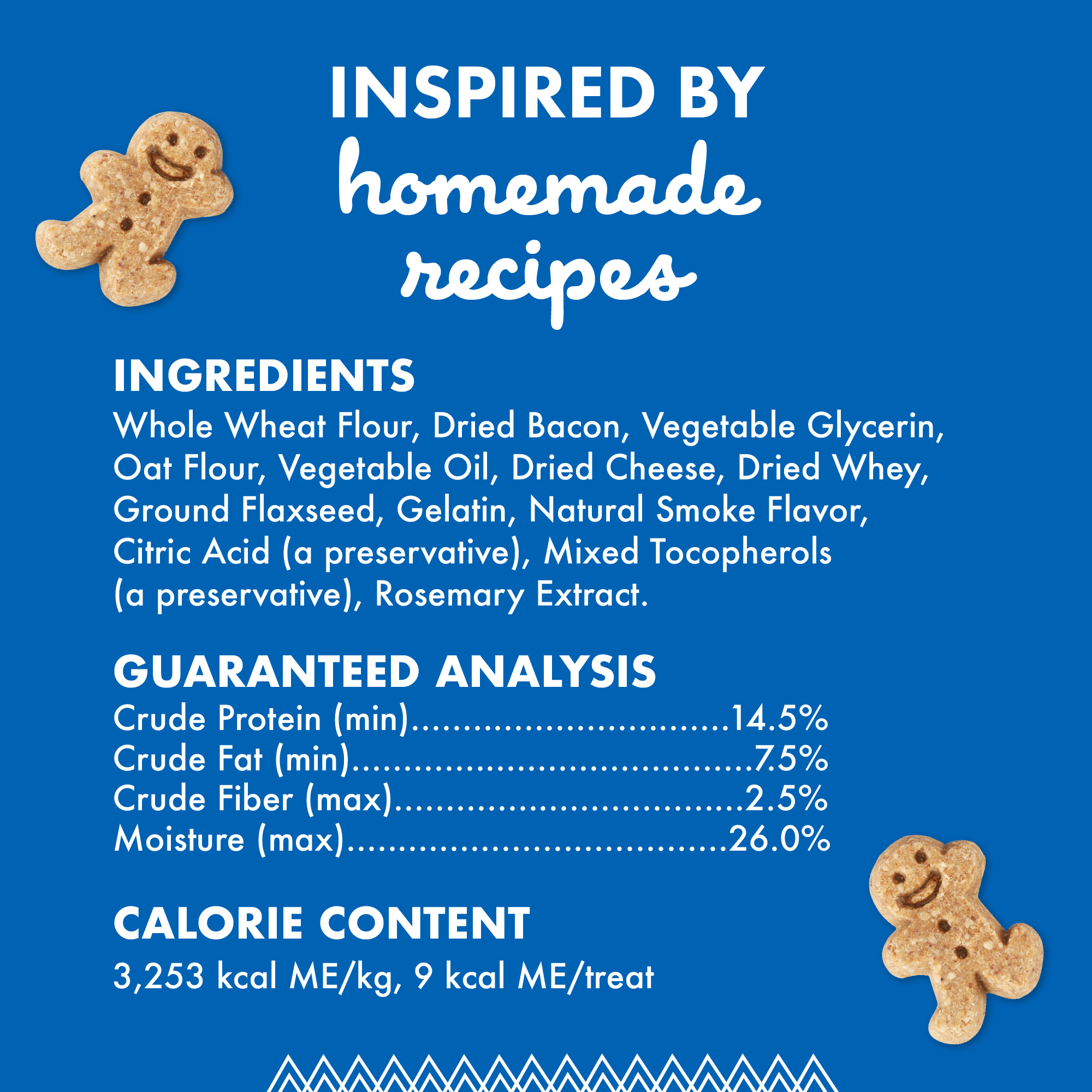 Whole Wheat Flour, Dried Bacon, Vegetable Glycerin, Oat Flour, Vegetable Oil, Dried Cheese, Dried Whey, Ground Flaxseed, Gelatin, Natural Smoke Flavor, Citric Acid (a preservative), Mixed Tocopherols (a preservative), Rosemary Extract.